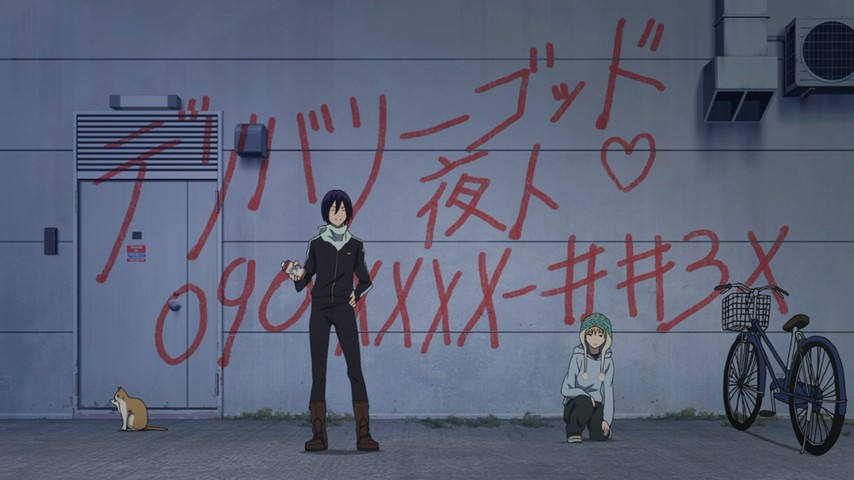 Yato, a scruffy-looking punk of a god, used to be a deity of war and mayhem, but lost his taste for bloodshed. That cost him worshippers, and power, but he's settled for a far simpler life as an odd-jobs man a la Gintama's Gintoki -- the kind of thing where he scrawls his name and phone number on bathroom walls and gets hired to find missing cats. At least his price is right: a measly five yen, the same he'd be likely to get for a tithe at his yet-to-be-constructed shrine, one he fantasizes about the same way the rest of us dream about the mansion we'd built after hitting the Powerball lottery.