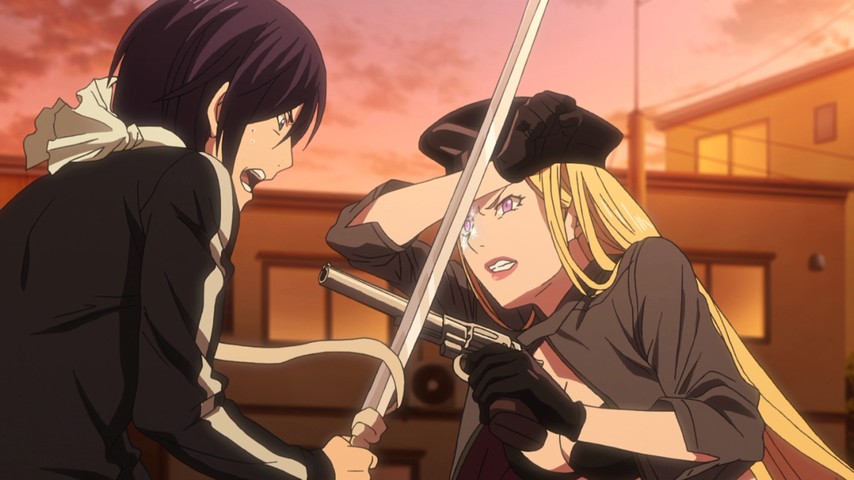 Most of the storyline for individual episodes is taken up with Yato, Yukine, and Hiyori confronting and taking down a monster-of-the-week while in the service of the Gandalf-esque deity Lord Tenjin. Other regalia-sporting deities also begin showing up, some of whom sport king-sized grudges against Yato — e.g., Bishamon, a femme-domme incarnation of the god of battle, still peeved at how Yato killed one of her regalia ages ago, and not terribly willing to let Yato just live it down. She also turns out to be the least of Yato's worries in that respect, especially as Rabō, Yato's old partner in devastation, returns to the playing (er, killing) field to pick up where both of them left off.