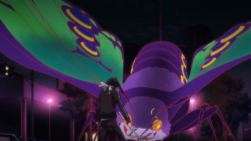 Lowbrow humor is something of a staple ingredient for most any mainstream anime; you scarcely get through an episode without at least a few dumb yuks. Noragami's no different: because Yato and Yukine have a high degree of spiritual connection through their bond, Yato can sense Yukine thinking dirty thoughts whenever Hiyori is around. But some of the other gags are a little smarter, such as a hilarious sequence where a suicidal office worker essentially tells Yato & Co. his life story while in the process of falling off a tall building. By the third or fourth cutaway to a flashback, the joke has reached Key & Peele levels of absurdity. (It works in big part because no one breaks the tension or comments directly on the absurdity of the situation; it's all done with straight faces.)
