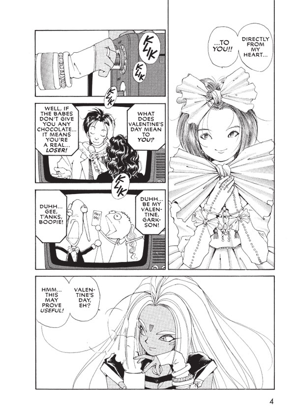 Most of the plotting for the first couple of dozen chapters is lightweight stuff. Challenges arise with the school's auto club where Keiichi is a member, with Keiichi's unwanted rivals, or with Keiichi himself; and Belldandy or one of the other goddesses (Urd, or bratty-little-sister Skuld) use their powers to try and make all a-right once more; but it's ultimately their personalities that make the most difference. Being a nice person matters more than having the powers of a goddess in this universe, especially since Belldandy's little red needle ends up pointing to "E" if she tries to do too much at once.