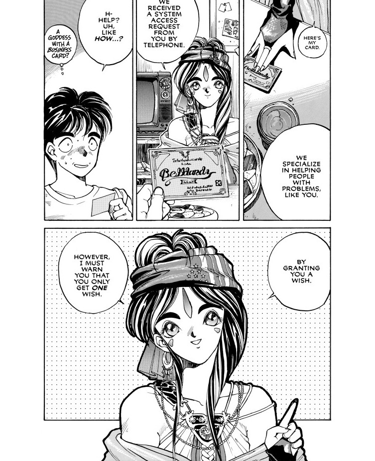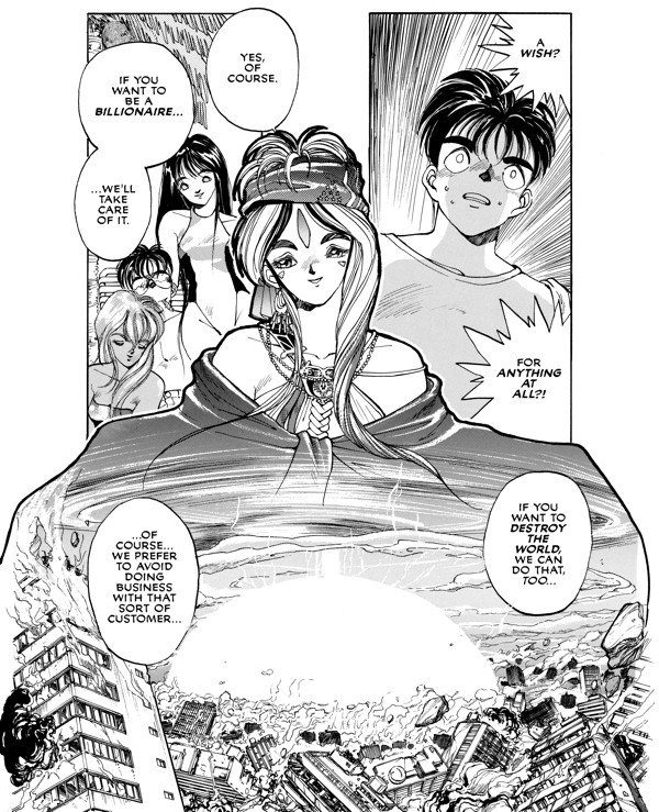 The goddess in question, Belldandy (theory has it her name's a mangling of the Norse Verthandi), can grant wishes and work wonders. Keiichi's been granted a single wish, and there's little to no limit on what he can ask for. Without thinking he'll ever have his wishes fulfilled, Keiichi asks for what he imagines to be the impossible: for a goddess like Belldandy to be with him always. He gets his wish ... although maybe a little too completely for his own good.