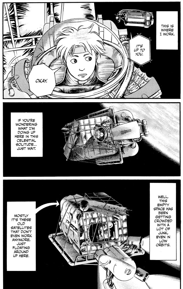 It's a tricky thing to "ground" SF in the familiar, to make it more about the grit of a job than the possibilities of the future, because that runs the risk of making it something that doesn't have to be SF in the first place. Makoto Yukimura's Planetes doesn't fall victim to any of that, in big part because the future world of 2075 shown in its pages is seen through the lens of the complications that come with humanity becoming a spacefaring being. What grounds it, and grounds it well, is how it's all seen through the eyes of a young, ambitious, apparently uncomplicated man whose complications and difficulties only become clear to use as gradually as they become clear to him.
