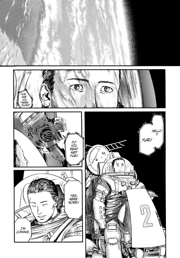Things come most to a head in this vein during a sequence where a his copilot on a training mission, Leonov, is injured when they make an emergency landing on the moon. Hachi lugs the other man for many a kilometer on his back, but when Leo confesses sotto voce that he has regrets about leaving others behind for this mission, Hachi blows his stack. He's not really angry at the other man, though; it's more that he's attacking the soft white underbelly of his own conscience, the part of him that is indeed weak in the face of the universe's indifference, the part of him that does in fact need the help of others, that does need love. This material becomes borderline trippy the closer we get to the end of the first omnibus, as Hachi confronts his own fears and desires as personified through various images: himself in a spacesuit, a dying cat, the void itself.
