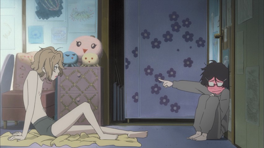 Some of why Princess Jellyfish's brand of funny in this vein works is a personal thing, and I know it. Tickle me the right way and I fall over laughing, not just once but over and over. I have a weakness for the kind of silliness the show makes use of; I mentioned screwball comedy, but also the cheerfully preposterous erotic hijinks of everything from nothing-in-common romantic comedy to Pedro Almodóvar's Women On The Verge Of A Nervous Breakdown. Or the fourth-wall-breaking fantasy sequence gags, where Tsukimi's pet jellyfish explains the Amars' behavior patterns with helpful diagrams. Or the credits sequence, where the characters visually namecheck everything from Sex And The City (see this article's key image) to Singin' In The Rain. Visual jokes in the same vein trick up the rest of the show, to inject a left-turn laugh as needed.