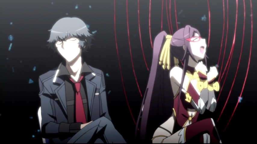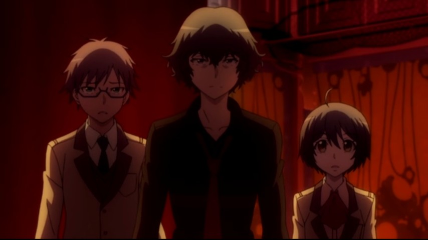 The most obvious reason Rampo's works lend themselves to being animated, and not just filmed, is the imagery. Animation lets you pre-emptively suspend disbelief, lets you treat people, places, space, and time as abstractions and concepts, rather than concrete things. One way Rampo Kitan leverages this, from the beginning, is to hint at how its heroes (and villains) see themselves as standing apart from the lesser masses around them — e.g., when Kobayashi's classmates are depicted as mere silhouettes. The trick itself is common enough in anime as a budget-saving measure, but here it's thematic, too. Another way is just by sheer lurid style, where all the decadence and madness that Rampo loved to pack his stories with come to life here in wild colors and florid designs. The animation studio, Lerche, has also produced a number of other mystery/thriller/horror series with a stylized bent: Persona 4: The Animation, Danganronpa: The Animation, and Assassination Classroom (although for my money that last one hews closer to comedy than a thriller).