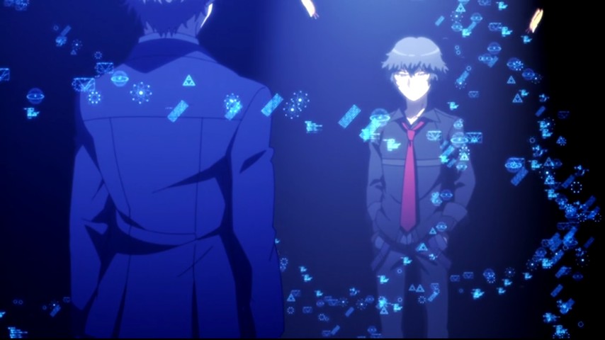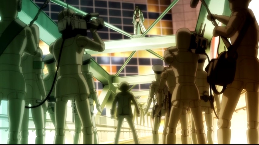 The question of where responsibility really lies expands even further by way of what is, in the abstract, a fairly easy plot twist: Akechi knows who the "original" Twenty Faces was, and for that reason alone has to take responsibility for stopping him. What complicates things further is that the culprit in question was someone he stuck up for and did right by when no one else would. He was a childhood friend of Akechi's, Namikoshi, a shy fellow who endured abuse both at home and in school, and who produced a real work of creative genius, a sociological quasi-Theory of Everything (shades of Hari Seldon's psychohistory from Isaac Asimov's Foundation stories) in spite of all that. Akechi didn't just feel for Namikoshi, but wanted to believe his work could be used to make the world a better place. He's still struggling with it, even when Namikoshi orchestrates a public mass suicide a la the Individual Eleven of Ghost in the Shell: Stand Alone Complex: 2nd GiG, and even as a veritable army of Twenty Faces are running riot in the streets, Fight Club style.
