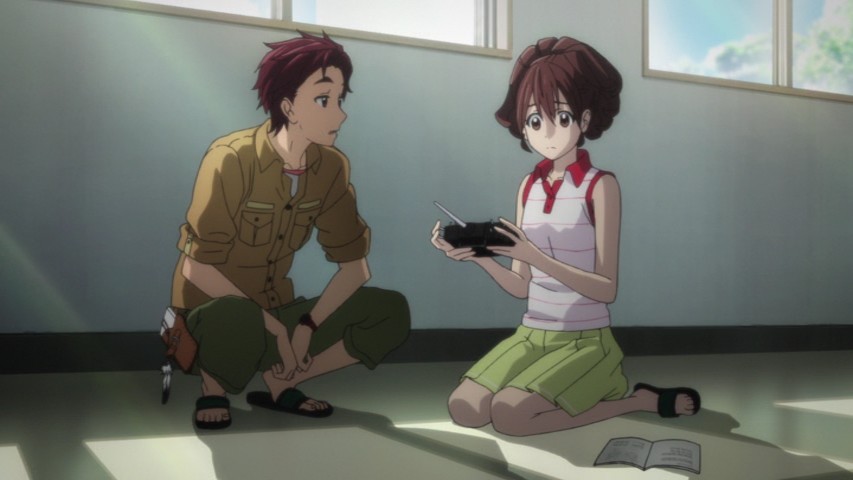 It's generally considered bad form to bash something for its origins, and I don't mean to bash on Notes for being derived from a game, since a good story can come from anywhere. But again, if the original material is followed slavishly in ways that just repeat its inherent flaws for the sake of its target audience, the source material hardly matters. Still, the fact that Notes is derived from a game means some of its story mechanics hew a little too closely at times to the checkpoint-reward or apply-skill-here paradigms that games use. Again, it hews close to being thematic — after all, Kaito's power is originally exposed through a game, and his in-universe quest is essentially a gamified process — but the story seems content to simply deploy such things as ingredients and not move much further than that. I couldn't help but think again of Steins;Gate, and how Okabe's "Reading Steiner" power started as a gimmick (and to some degree a character quirk), but pushed the story foward because of who Okabe was, and soon proved itself to be integral to the story as a whole. (I should note that the way both shows share a common universe is so tangential a connection it might as well not exist; it's essentially a marketing ploy.)