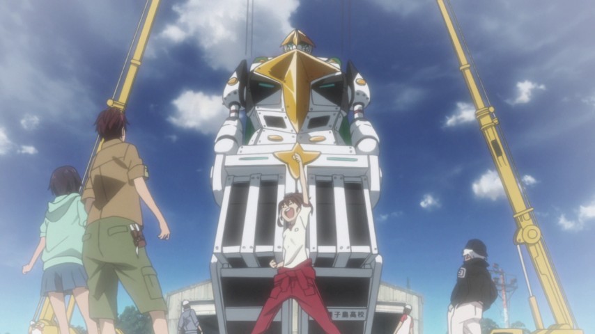What does work in this show, though, is the way it depicts Kaito, Akiho, and the rest of the club inching towards their goals and savoring every victory along the way, big and small. The first iteration of their giant robot is barely able to walk, and a crowd that's gathered to see it happen is understandably let down. But this doesn't deter them: if anything, it only gives them all the more incentive to make the next iteration of their creation all the better. "Never stop improving" isn't just good engineering practice, but good life advice, too, and so by the time their robot is not only taking much bolder (and faster) steps, and even delivering knockout blows to an opposing robot of far greater sophistication, it's undeniably thrilling, not just because of what it's showing us but because of how it unfolds as much in the minds of its participants as it does in the real world. We share with them the joy of watching one's creations come to life, the agony of watching them fall or be destroyed, and the determination that they can be resurrected and be even better in the next incarnation. In moments like this, the show works well enough to throw all the moments it doesn't into even sharper relief.