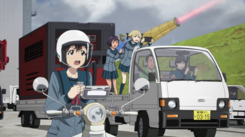 Notes opens with something of a classic plot, anime or not: the Kids With Big School Club Ambitions. Rather than putting on a play, these kids want to make a giant robot — and the remarkable thing is, after several succesive years of club members coming and going, they've managed to cobble one together after all, just barely. The current club president Akiho Senomiya has prodded, cajoled, and exhorted the group to come ever so close to finishing a giant replica of "GunBuild-1", the mecha at the center of the (in-universe) anime Gunvarrel, but they're short of cash to cross the finish line. Their only hope is a cache of prize money courtesy of a robot combat tournament being held in a couple of weeks.