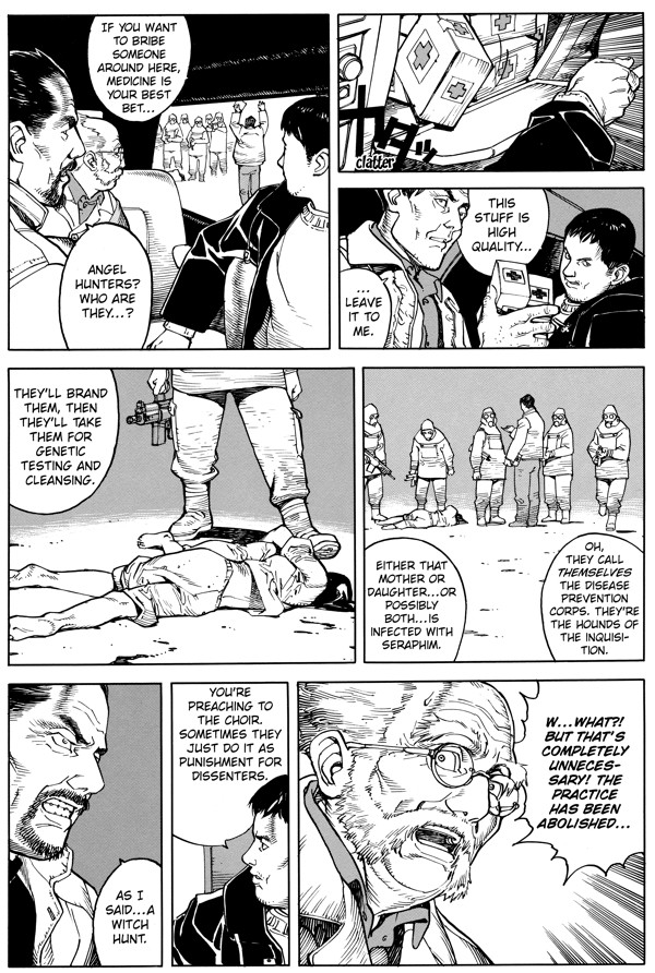At first Seraphim doesn't tell much of a story, being content instead to show us one remarkable image after another. Fighter planes being escorted by flocks of birds, each bird as big as the plane itself; the squalor and chaos of the refugee camps; the bristling wrecks of the dead cities; the corpses sprouting wings. Then once these "wise men" (that's how they're referred to, with a straight face) climb into jet planes and head inland, the pieces begin to accrue. We learn about Yakob's status as a "rabble-rouser", fighting (if ineffectually) for the protection of the powerless; we find Erasmus left the Magi when it tilted that much more towards genocide as a solution to the disease; and we learn that much more why mute little Sera is so important — and why removing her from what's left of civilization may be the only way to save both it and her.