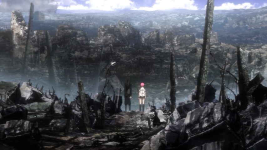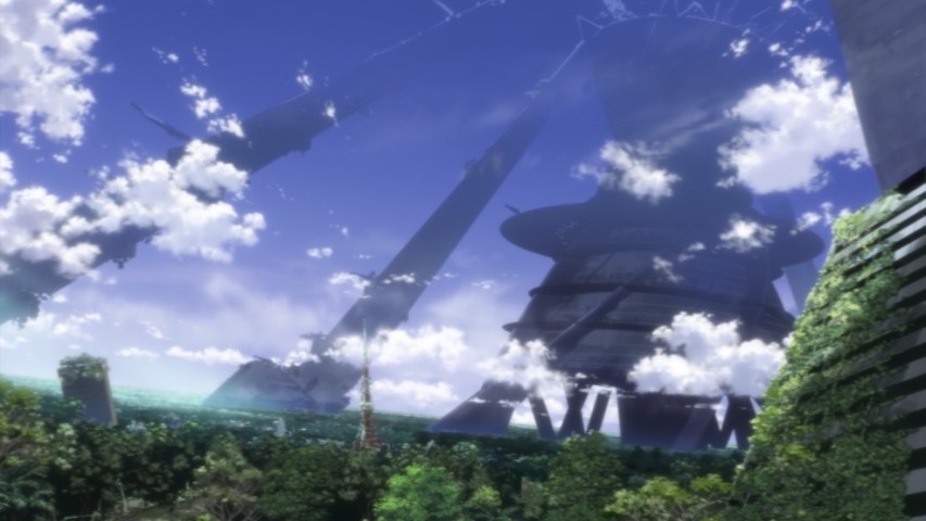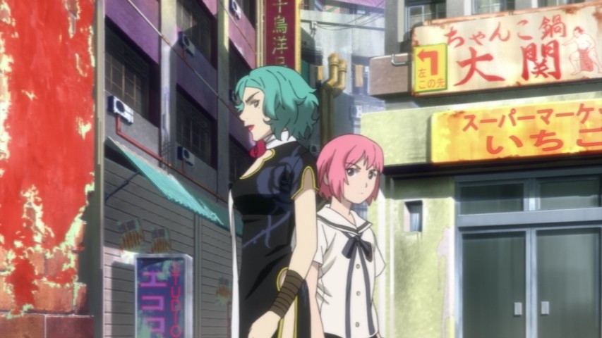I should add, in the interest of fairness, that this all constitutes less of a net negative than it sounds like it ought to, if only because Shangri-la does declare its hand fairly early on. Big, broad gestures are the point, not a by-product or a drawback. Such an approach always runs the risk of toppling over into silliness, but it's nothing if not consistent with the overall plan to take the story's ideas and go big or go home. There's even room for a certain amount of moral ambiguity, as when Kuniko and one of the Atlas soldiers (a chap named Kunihito, the one wielding the aforementioned mystic dagger) get into a heated argument about the merits of terror versus taking Atlas's charity. Both sides have their points, although the show is less interested in testing the validity of either argument than it is in having all such arguments rendered moot by a much larger, mutual enemy. I'm still on the fence as to how wise that is as a storytelling strategy, especially when the Big Bad turns out to have a quasi-supernatural element — something existing anime fans may have less of a problem with than people coming in from more conventional dystopian SF.