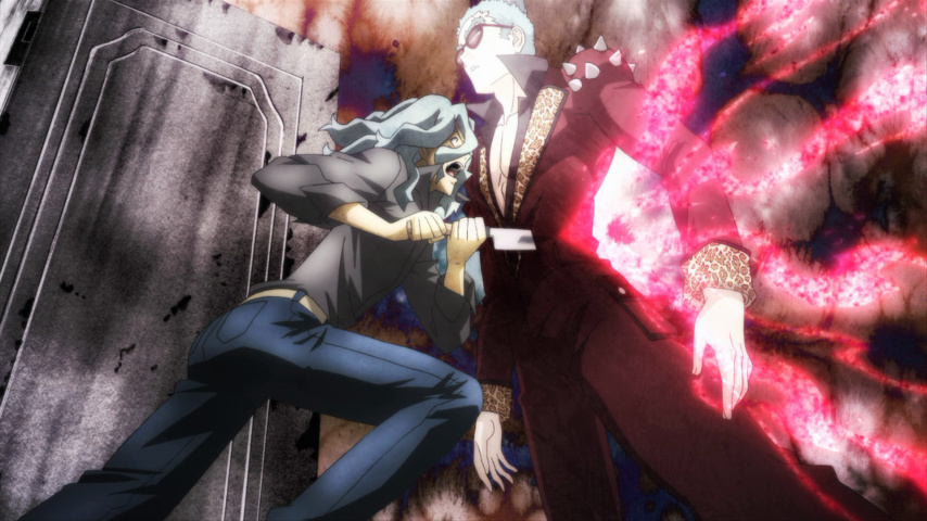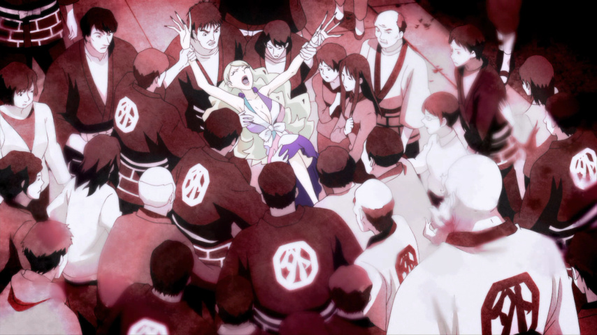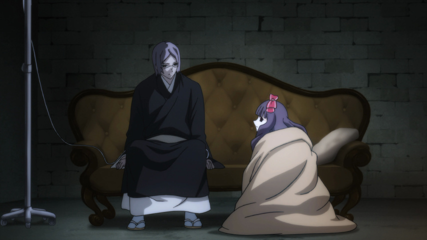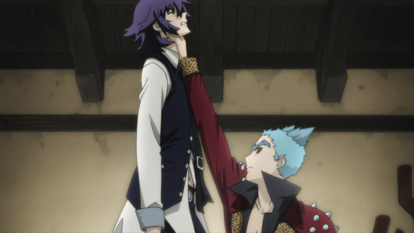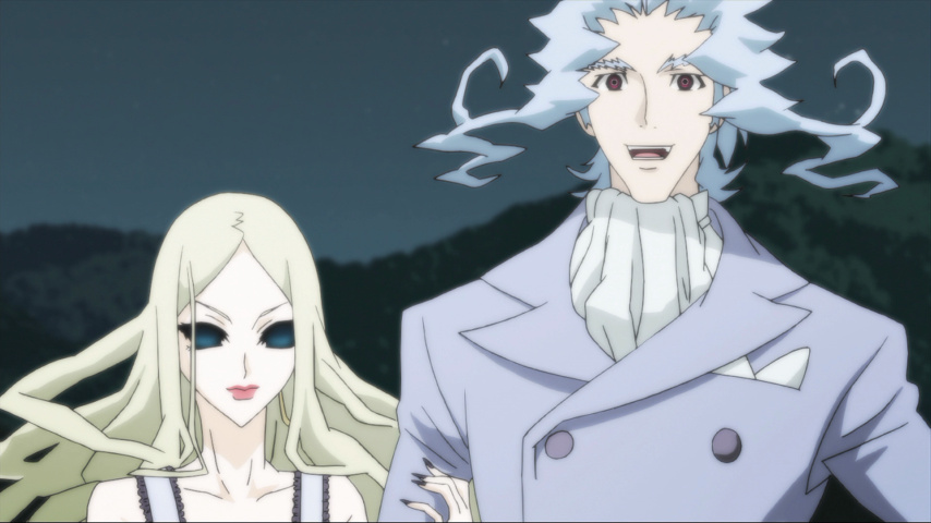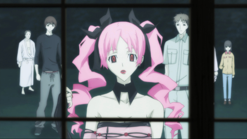 It's the appearance of Sunako that puts the first rift between the two men. A young girl in elaborate Alice-in-Wonderland clothes — but with large hollowed-out eyes that look like bullet holes in the head — Sunako trapises into town one evening and insinuates herself with Muroi. One of the monk's extracurricular activities is being a novelist, and she claims to be a fan of his work. He's only too happy to welcome the attention, but the blunt and disturbing way she talks to him about the dark places in his soul (and the not-quite-faded scar on his wrists) speak of different motives on her part. She could in theory turn him at any time, but in time we see how she wants to preserve the complexity of the relationship between them: that of a penitent looking for a place to make a confession, although the show deliberately blurs who is in which role.