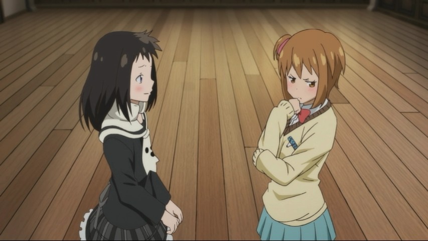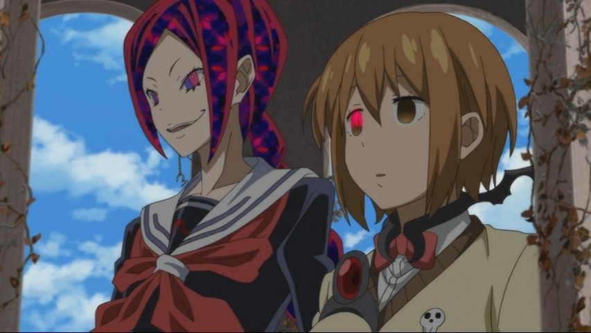 Anya and Meimei are both Meisters, and so of course much of the plot concerns, however indirectly, which of them gets to wield Tsugumi — with all of the quasi-sexual implications hinted at therein. A dismaying number of the jokes about Meimei don't merely involve her being an airhead, but also involve her bust size, or how little clothing she has on for a given moment, etc. For a show based on a shonen property, it leans rather uneasily towards seinen territory; it's enough to make you wonder what the target audience really is.