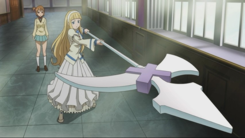 With Not!, the focus is now on a trio of new students: Tsugumi, who hasn't quite mastered the art of fully transforming herself into the halberd-like weapon she can be; Meimei, a wide-eyed and perennially clueless type who can't remember what she was doing five minutes ago; and Anya, a princess — as in, a genuine blue-blooded member of royalty — with ambitions of learning more about the lives of commoners. (Commoners, yes; ordinary humans, no.)
