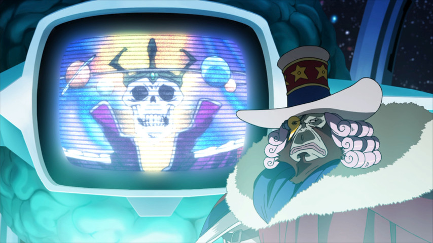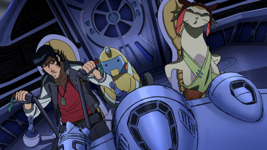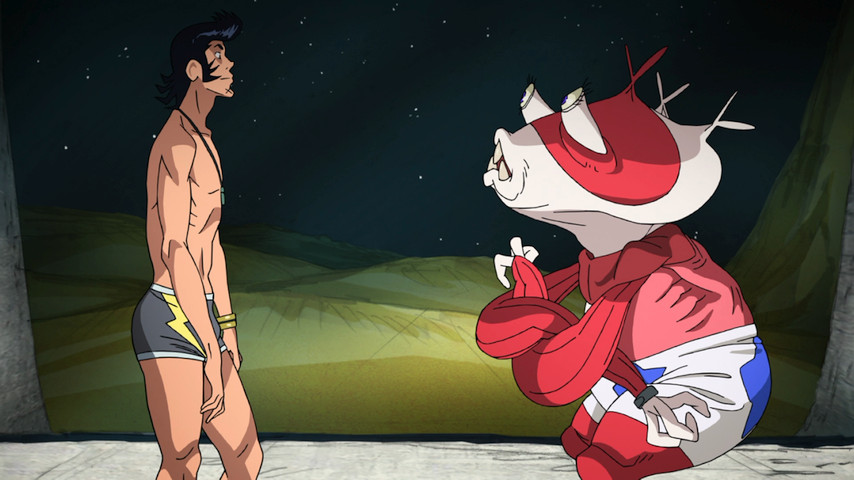 It's the c), not the a) or the b) that's the most important part of this formula. Consider an episode where Dandy ends up on a planet covered with sentient vegetation, where the art and animation style are pure Sixties psychedelia (courtesy of Eunyoung Choi, of the magnificent Tatami Galaxy and also the Adventure Time episode she co-directed with the inimitable Masaaki Yuasa). What little plot there is amounts to a shaggy-dog story, akin to the one about the kid born with a golden screw in his navel; it's all about what kind of trip we can have along the way. Given that the conclusion of each episode really doesn't matter one way or the other, this sets the crew free to show us any manner of nonsense with a straight face.