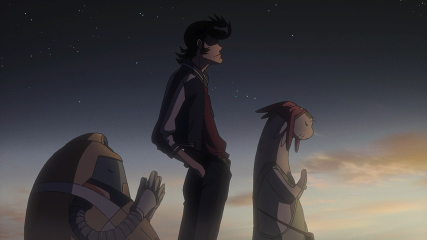 So what about Dandy himself? His personality's far closer to the Holy Jerk than the Holy Fool a story this picaresque might have at its core. In fact, I'm not sure Dandy is meant to be a "hero" — he's more like the guy we happen to have in the airplane seat next to us when a wing breaks off. He's not supposed to be special; his highest ambitions in life revolve around female body parts and quick scores. But that very attitude winds up seeing him through any and all manner of world-wrecking, when those far more ambitious, powerful, or intelligent than him are laid low. By the end of the show (warning, spoilers), he's offered the opportunity to become the master of all creation — but he turns it down, because the messy and enjoyable business of daily life is more than enough for him. The part of me that has studied Buddhism and theology is tempted to call that profound; the part of me that has seen too much anime knows full well that's more just the creators nudging us in the ribs and winking at us.