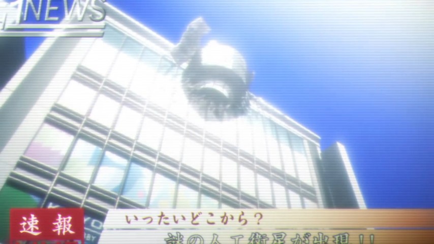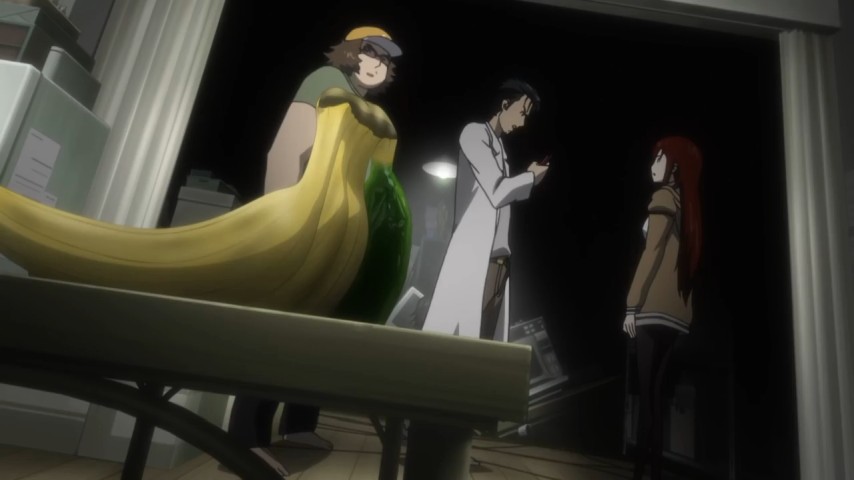 One sweltering afternoon, a toolbag full of monkey wrenches gets upended into their lives. Okabe and Mayuri attend a lecture on time travel — it's totally over Mayuri's head, but she never turns down an excuse to do something interesting with her big-brother substitute — only to have one strange thing after another unfold. A woman Okabe has never met before insists she talked to him only fifteen minutes ago; minutes later, he encounters the same woman lying in a pool of blood, apparently dead. A satellite-like whatsit materializes on the roof of the lecture hall building. Objects placed in the lab's microwave melt into a bizarre green gelatinous substance. And the dead woman turns up alive, well, and plenty miffed at the idea that she was believed to have been dead in the first place.