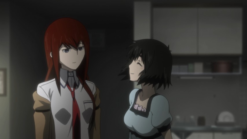Makise Kurisu is uneasy about Okabe's alleged time-travel gizmos, but takes a shine to Mayuri.