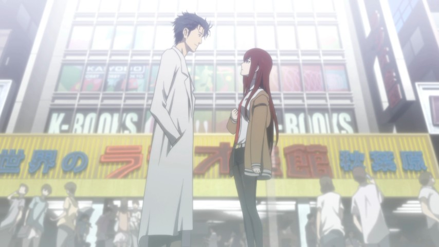 What works best is the sweep of the whole, the arc from frothy banter to reality-hopping transcendence. I'm fondest of stories that begin from a simple beginning and grow until they seem to contain everything, but never lose touch with the human seed they flowered from. At one point Okabe admits "I made this place [the lab] because I couldn't invent friends," and the underlying conceit — the lab is in fact what created this circle of friends, just as that circle created the lab — only grows more important as the stakes and the scope rise. Near the end Mayuri has a monologue about her introduction to the lab, how it was and still is a place to call home, even if nothing "happened" there. But something was happening there; a few people who didn't really fit in anywhere found something to share, and a way to matter to the rest of the world — even if they're the only ones who ever know how important it all is.