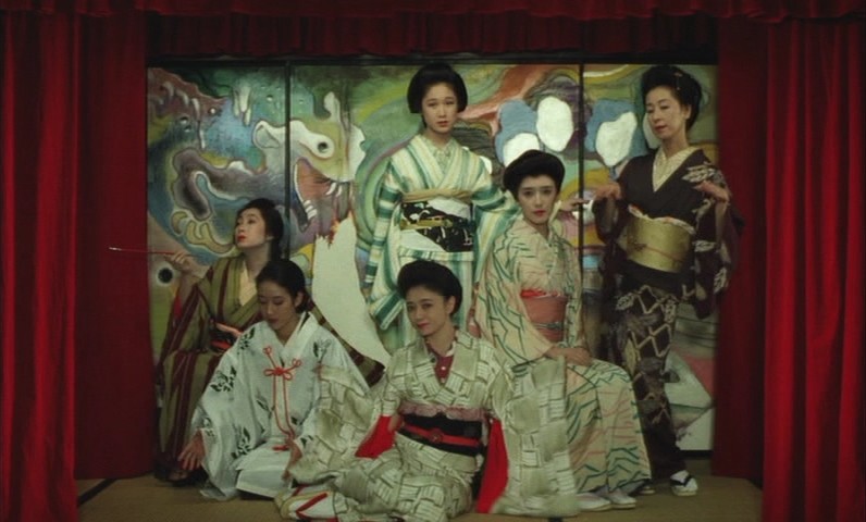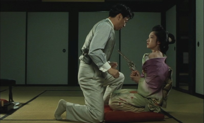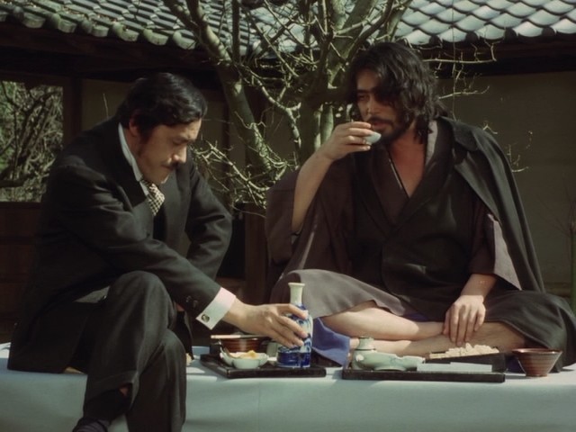 What's worth drawing the most attention to is not just the way the two men, and their women, embody different sensibilities of manhood and womanhood from the period. It's the style Suzuki brings to this film and the rest of the trilogy as well — a style so mannered, so stylized, that it becomes inseparable from the story being told. The way the camera frames objects, the way characters and props are lined up and played off, the way apparently random cutaways and digressions turn out to have central importance later on, all borrow as aggressively from theater as they do Suzuki's own earlier showcases for mannered cinematic style (Branded To Kill, Tokyo Drifter). And the theater in question isn't just kabuki, either — the easy reference for a movie like this — but also self-conscious Western stage works like Samuel Beckett's, where the fourth wall tumbles and where the meanings of things take on lives of their own.