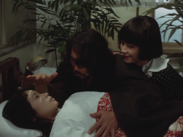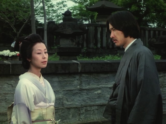 Like Zigeunerweisen, Kagero-za is about two men in contention over two different women. Playwright Matsuzaki (Yūsaku Matsuda, here playing drastically against his usual tough-guy type) has a series of run-ins with an odd woman named Shinako (again, Michiyo Ōkusu, as demure here as she was flamboyantly carnal in Zigeunerweisen). She claims she wants someone to walk her to the hospital where she can meet a sick friend. Matsuzaki comes to believe she may be the spirit of the dead wife of his literary patron, Tamawaki (Katsuo Nakamura), a smirking, shotgun-toting prig who provides a blunt contrast to Matsuzaki's dapper yet introverted manner. Surely a lady this fine deserves someone better, and so Matsuzaki beds her down the ghost (?) in a scene that manages to be as gloriously absurd as it is tremendously erotic.