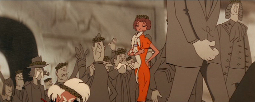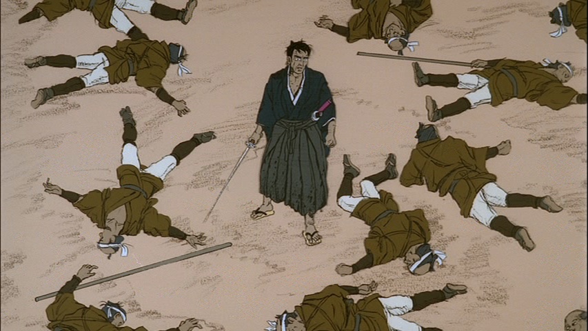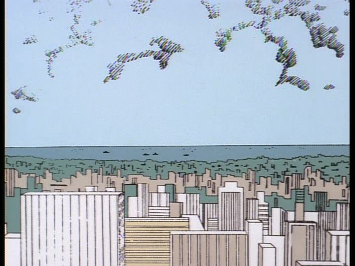 “Exhibition” is Tezuka’s take on what could have been a completely predictable project: setting Mussorgsky’s now-hoary music (as arranged by Isao Tomita) to animation. A lesser director would have maybe taken the paintings in question and created little manqués out of them. Tezuka uses each movement as a way to skewer the “heroes” of the age — the TV celebrity, the prize fighter, the soldier, the industrialist — and then uses the final movement as a way to hint at what’s really lying under the rubble of all that pseudo-culture. You might object to the rather jaundiced politics on display (Tezuka’s view of journalists is dour — shilling for sour), but you can’t call it lacking in vision.