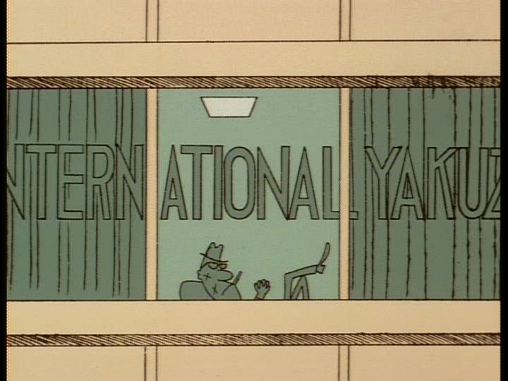 “Jumping” is one of Tezuka’s most widely-described animated shorts, and like the best shorts it consists of one idea executed brilliantly. The camera serves as the POV of someone, or something, jumping higher and higher with each successive leap. At first each jump is no more than a few inches. Then we bound over cars, houses, buildings, cities, oceans, through battlefields, up to Heaven and back down to Hell … and there’s more but I wouldn’t dream of spoiling the joke. Half the fun is letting the audience fill in the blanks — is this a frog? a kid skipping rope? The other half is in all the little touches that flash by, like the office building full of hilarious caricatures. (Use the frame-step function on your DVD player; there are more Easter eggs in this movie than you’ll find in a whole briar patch.)