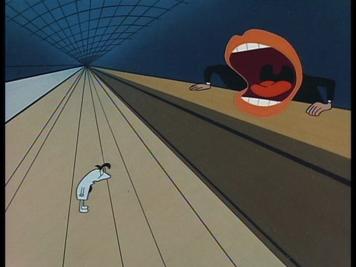 Few people outside of Japan or the film-festival circuit have ever seen those films, but Tezuka has become a more familiar name in English over the past decade, and so there’s now a market for a DVD anthology of that work. The Astonishing Work of Tezuka Osamu (last name first in the title, as per Japan’s naming conventions) compiles thirteen of Tezuka’s short animated productions (total time, two and a half hours) along with a half-hour interview with Tezuka itself. Even fans of Tezuka’s work in all its breadth might not recognize most of this as his product if his name wasn’t on it.