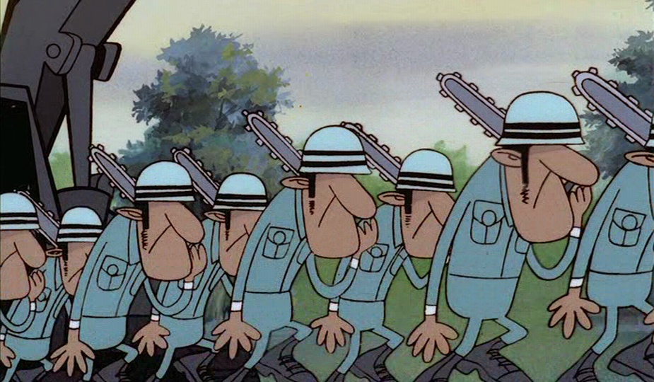 Many of the other pieces are similarly political, something Tezuka was never shy about putting into his work. “Legend of the Forest” uses Tchaikovsky’s Fourth Symphony as a framework on which to hang a production that’s part history of animation techniques, part Disney homage and part environmentalist warning. “Push” shows a future Earth where the only things left are dispensing machines, symbols of how mankind unthinkingly trashed his world by milking it for resources. A few of them are broadly funny, as when Tezuka caricatures the way human memory functions by stripping a man’s memory of a woman down to nothing but her bust and lips — or when he uses the way the film itself can malfunction ("Broken Down Film") as a wellspring for one sight gag after another.