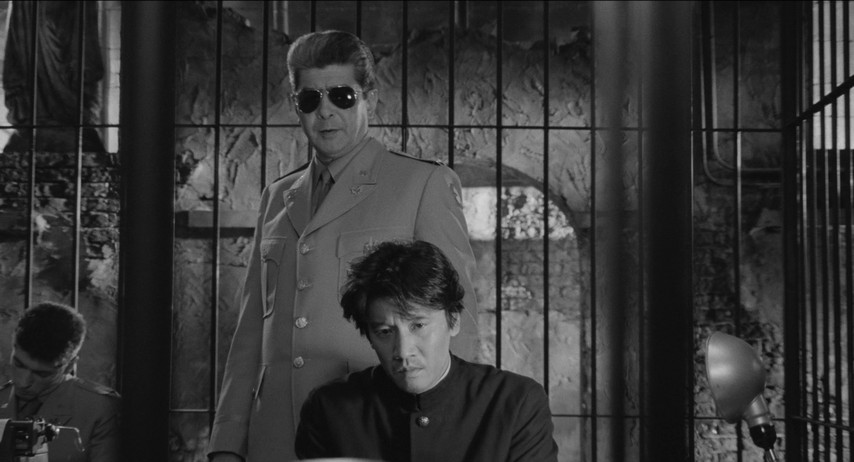 The movie replaces the bigger flashback with a more compact one. Suguro (Eiji Okuda), in the custody of the occupying U.S. forces after the war, tries to explain his complicity in the atrocity. He was low in the ranks at the hospital, and part of a faction attempting to ensure that their own chief surgeon and department head (the "Old Man", as they called him) would rise in the ranks. One way to do that, as Suguro finds out, is to curry favor with the army in whatever way they can. Suguro is too timid and reticent to say anything about this, but then again even the more assertive ones either say nothing, or — in the case of Toda (a young and unsettling Ken Watanabe), Suguro's wolfish partner, they embrace it.