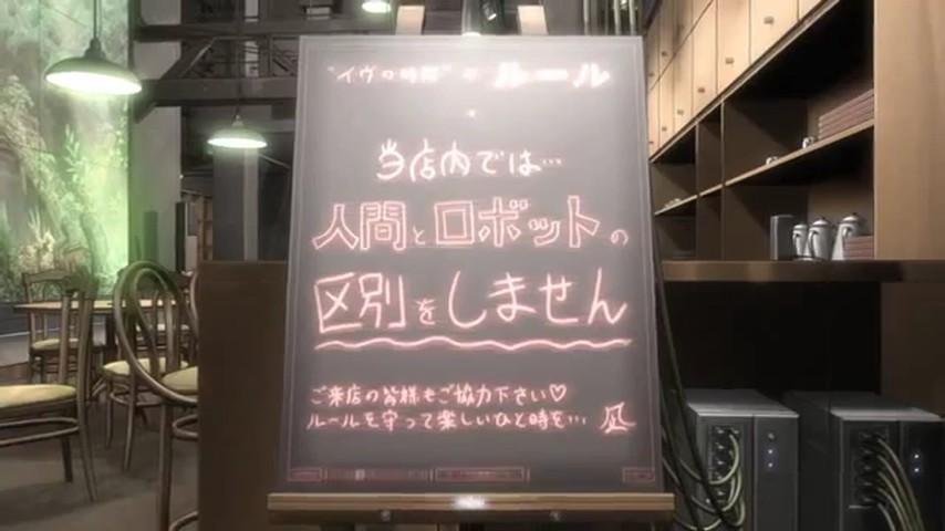 Rikuo and his school chum Masaki decide to tail Sammy, and find her repairing to a clandestine below-the-sidewalk club of sorts. "Time of Eve", as the place is called, caters to both androids and humans, with the stipulation that there is to be no discrimination between the two. Androids there have their status displays turned off, and behave with many of the same idiosyncracies as humans — in much the same way servants and peons loosen their ties and kick up their heels when the master has gone home for the day. It's a speakeasy for a society where the crime isn't bathtub bourbon,