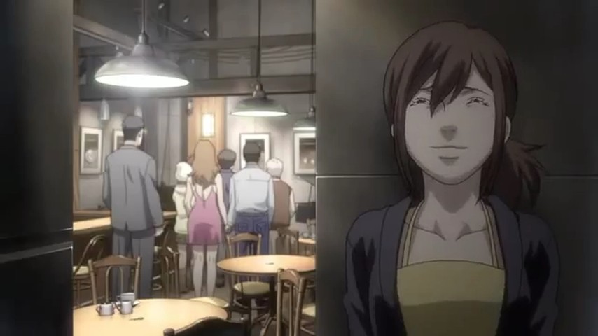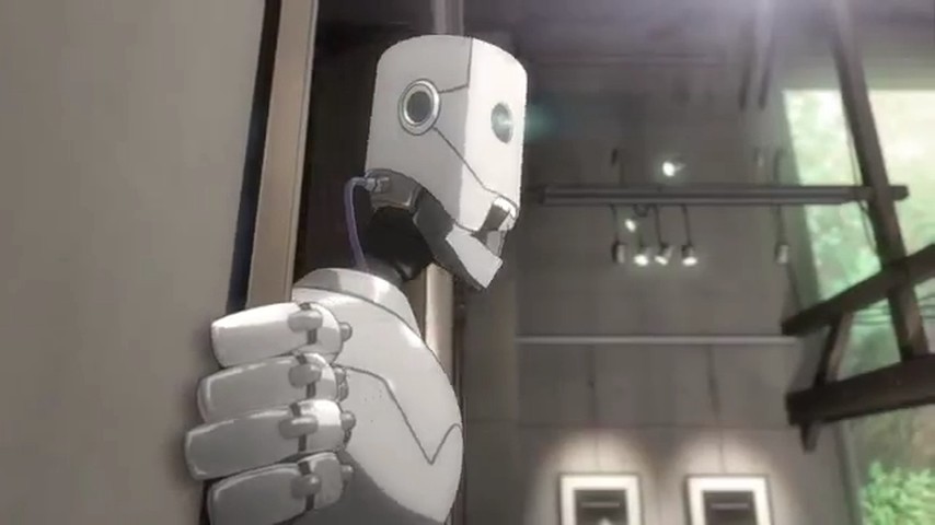 The ultimate aim of having Rikuo and Masaki pay witness to these things is twofold. First, it brings about within them — Rikuo, mainly — a change in attitude towards androids. Once having seen them as sentient beings, it's hard for them to un-see that. Whenever Rikuo returns home and sees Sammy standing in the kitchen docilely offering to prepare coffee, it's impossible for him to just see a piece of machinery anymore. He knows what's behind the mask now. Second is how it prepares Masaki for a confrontation with how he has, in fact, had a tender spot for his family robot as a child. When his father, an Ethics Committee member, tracks both son and 'bot to the café, it causes the 'bot to examine its Asimovian Three-Laws-style programming and look for a creative way to protect a human being from harm.