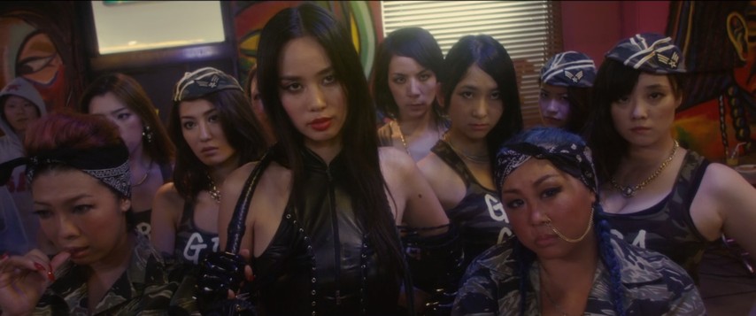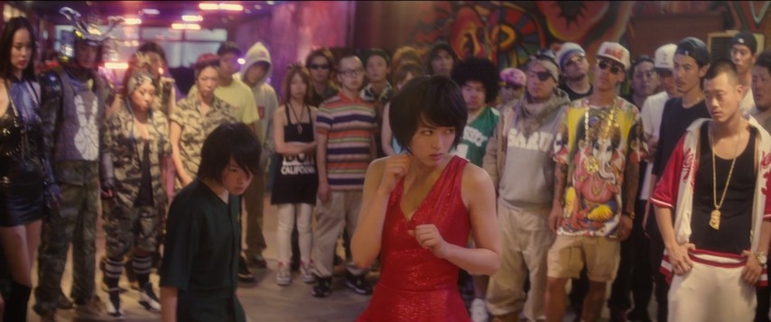 What the movie works best at is setting a tone and delivering a spectacle, and that it is able to do that for two straight hours is impressive. I like it when a story gives us a wall-to-wall gallery of oddballs to fill out the edges of the screen, and Tokyo Tribe seems to have been custom-built around that concept. Consider the grandmother-behind-the-wheels-of-steel figure who's used as a bookend for scenes, or one of Buppa's girl servants who provides a beatbox soundtrack to everything she does. And the dialogue is just this side of Shakespearean in its determination to versify everything. (Kudos to the localizers, too: even the subtitles rhyme.)