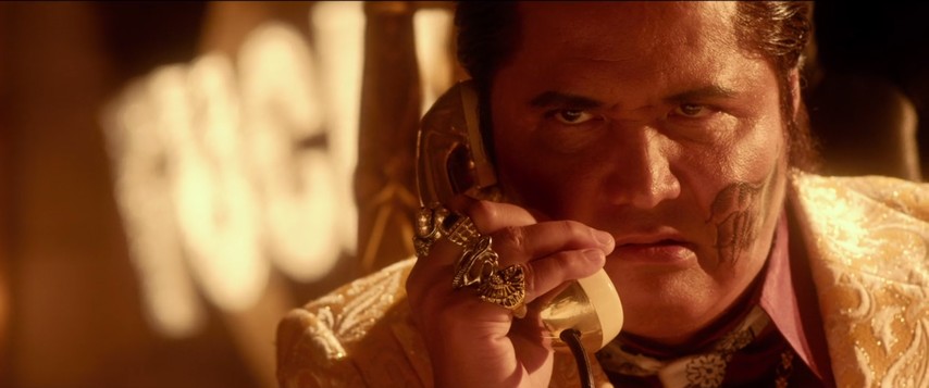 Some of this also stems from the way the movie's so eager to fill the screen with crazed visions, it forgets that not everything belongs there. When a rookie female cop tries to bust Mera for hustling drugs in his mixtapes, he rips her clothes off with a knife and uses her body as a map (and his knifepoint as a map-marker) to show where in Tokyo the various tribes hold court. A moment like this would be right at home in some 1970s "pinky violence" (girl-gang) film, clearly one of the many sources of inspiration for Tokyo Tribe. But this isn't a cheap little grindhouse flick; it's a big-budget production. Here, it comes off as saying more about what the filmmakers were willing to stick into the movie than it does anything about Mera, or the world he's in.