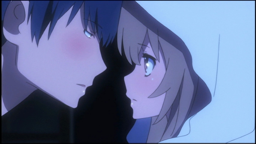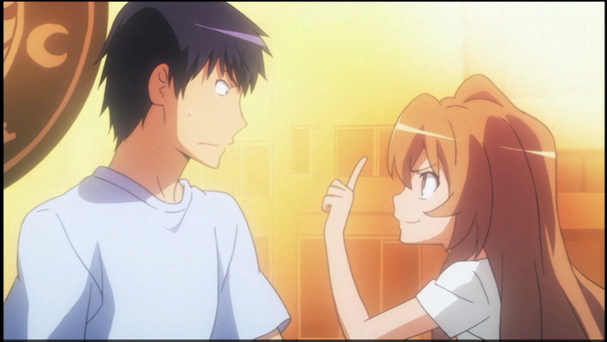 Into his life comes Taiga Aisaka (the "Palm-Top Tiger"), a female classmate whose tiny size is inversely proportional to her temper and her propensity for explosive violence. Ryūji's little rabbit-hutch building is in the shadow of her much larger luxury apartment complex, and after Taiga puts a love letter intended for someone else into Ryūji's bag, he ends up paying her a visit. Her place, despite its tony appearance, is a slovenly mess: she seems to be living there alone. Ryūji, already accustomed to being domestic for the sake of his perpetually-sloshed bar-hostess mother, decides to help her get the place in order and maybe get some food into her that wasn't purchased from a convenience store.
