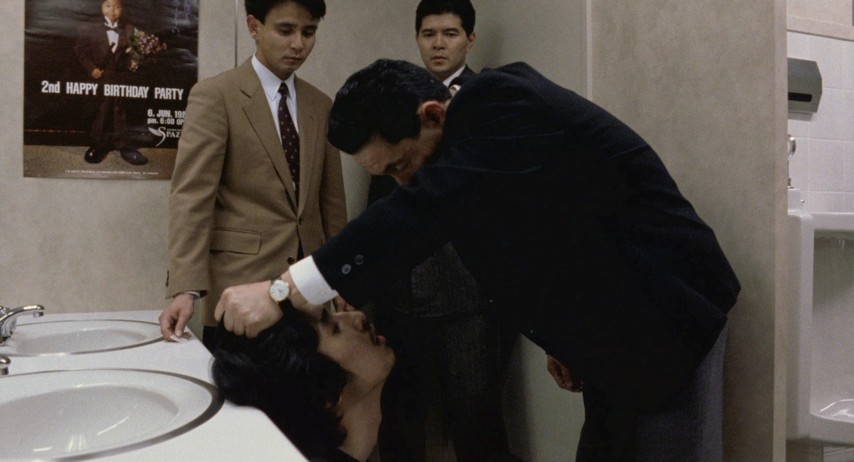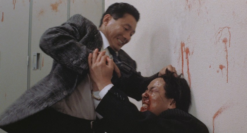 The abuse of power doesn’t end there. Azuma beats Kiyohiro to a pulp in the police station locker room after failing to trick the guy into shooting him. When the assassin sneers "You’re nuts, just like your sister," it acts like a trigger release: Azuma shoves his gun into the man’s mouth and tries to blow his head off. It takes four other cops to pry them apart, one of whom gets shot through the shoulder for his trouble. Azuma's boss makes a big show of firing him in front of his fellow officers, but in private his boss gives him the opportunity to resign on his own. A hint, one of many, that Azuma's excesses were the sort of thing the department secretly sanctioned and tolerated; why else even give him the chance to save face?