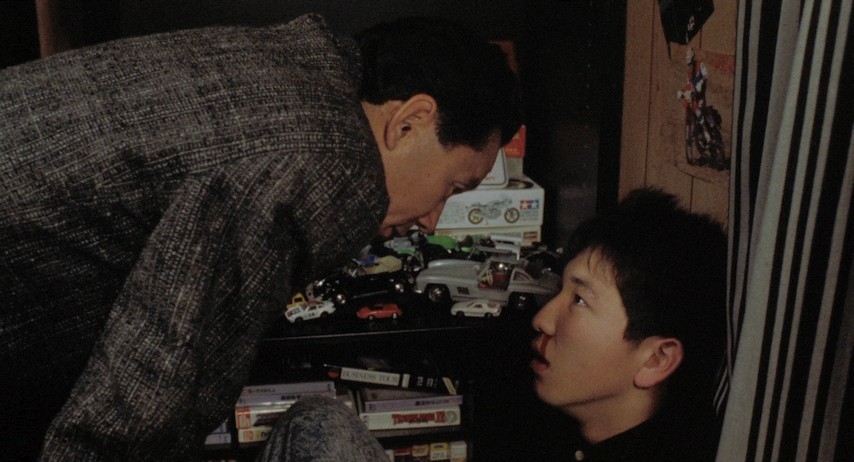 Violent Cop wastes no time setting up its mood, as the very first scene involves a gang of teenaged boys beating a homeless man senseless. At first there’s only the man smiling toothlessly as he eats something (soup?); then a soccer ball comes plummeting into the frame and bashes into his belongings. The camera lingers dispassionately as the kids punch and kick him; when he collapses, they applaud, cheer, and head on home. Azuma (who has been presumably watching all along) spies one of the boys returning to his house, strides in, and tells the kid to turn himself him. "I didn’t do anything!" the boy whines. "You didn’t do anything? Then I didn’t do anything, either!" Azuma bellows, and pounds the kid’s head against the wall.