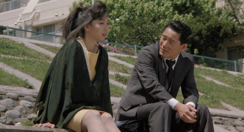 The only things Azuma cares about at all are his sister and his friend in the police force’s vice squad, Iwaki (Shigeru Hiraizumi). Iwaki is bespectacled and competent, as serene as Azuma is coldly undisciplined, but the two of them have somehow become close friends, inasmuch as Azuma seems able to form friendships. Azuma’s sister has some undefined mental problem (some people have theorized she’s an ex-druggie who suffered brain damage); the first time we see her, Azuma is picking her up from a stint in an institution. She’s placid, gentle, and utterly harmless, which may be—if I read the movie’s algebra correctly—why he is so compulsively protective of her. At one point he comes home to find she’s picked up a man at a bar (or is it the other way around?). He drags the poor sod out into the street, kicking and punching him all the way to the bus stop. The sister is wholly unperturbed, and the movie hints that perhaps she is simply not functionally capable of understanding her brother, even though she clearly loves him nonetheless.