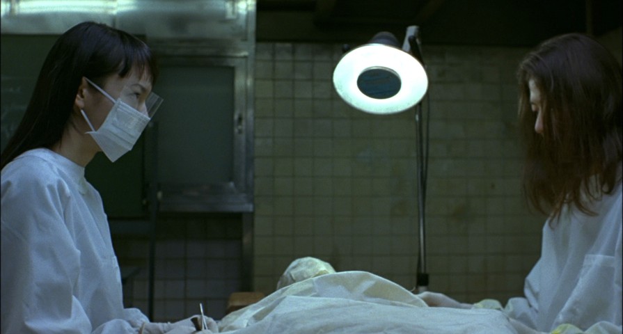 Then comes the dissection lab, where Hiroshi and Ikumi are partnered by the soft-spoken Dr. Kashiwabuchi (Ittoku Kishibe) to work on a human cadaver, a young girl. The sight of the dead body revolts Ikumi, but Hiroshi has an even more disturbing reaction: he recognizes the tattoo on the arm of the cadaver they're dismantling. He knew this girl. She was a girlfriend once, and they were riding together in a car when a truck smashed into them, killing her but leaving him alive.