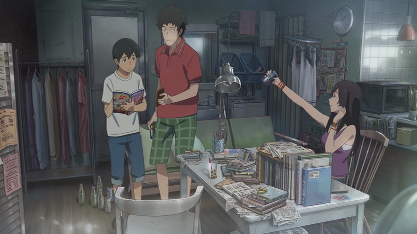 Of course this is a gorgeous project; it's a Makoto Shinkai film, and his movies are gorgeous to behold in a way that never disappoints. Shots of raindrops plinking on the pavement are animated with more detail than the characters in some other films, and a signature image in the film — a shaft of sunlight piercing through a hole in the clouds — gets depicted with the beauty and majesty it deserves. And I liked all the little touches, like the notches in the doorjamb where Suga measured his daughter's growth. It's a shame the back half of the story doesn't benefit from that kind of loving craft, especially since the front half is so solid and promising.