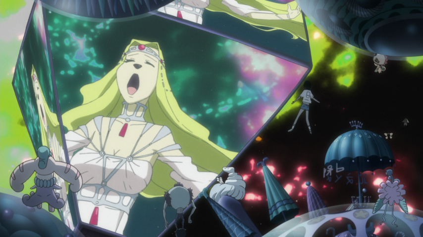 Even if the movie didn't work on an emotional level, it certainly works as a parade of uninhibited visual imagination. Animation, no matter where it's from, is a license to present us with the cheerfully impossible, and the universe these five kids are thrown into is like a museum of such things. Some of it is the characters, like Ink, a girl who works with her father as a junk scavenger and who not only has hands growing out the sides of her head but manages to look adorable and not at all creepy because of that. Sometimes it's the scenery, such as the gargantuan Space Show itself, a cross between Cirque du Soleil and a mammoth spaceborne city. Sometimes it's in the riotously colorful animation, the vast majority of which is hand-drawn and all the more impressive for it — especially in the sequences where Pochi suits up in a kind of energy armor and goes to town on his pursuers. And sometimes it's in the little touches in the corners of the screen, as in the way the same alien never seems to show up twice in the backgrounds of shots. (The movie's psychedelic design work owes at least as much to the likes of Vaughn Bode, Ralph Bakshi, and other 1970s tripsters as it does anything anime-influenced.)