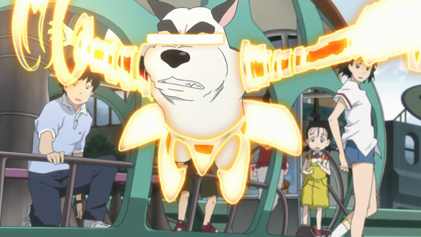 Barring its zap-and-bang cold opening, Space Show begins as if it were one of the many anime productions about the joys of bucolic country life. Five youngsters — de facto leader sixth-grader Kiyoshi, dreamy fifth-grader Natsuki, reticent fourth-grader Noriko, voracious bookworm (and UFO buff) third-grader Kōji, and cheery second-grader Amane — are spending part of their summer together on a self-managed school trip. There's not much to do, and so they hunker down for what they suspect will be many uninterrupted days of sheer boredom. Then comes drama in the form of Natsuki mistakenly allowing the class pet, a rabbit they've named Pyon-kichi, to escape. When the kids band together to search the surrounding countryside, they find instead a dog, injured and unconscious.